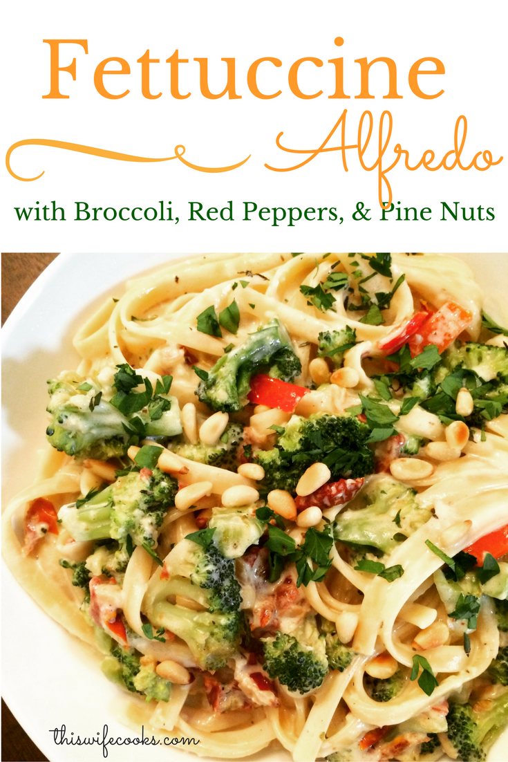 Creamy Vegetable Alfredo Pasta, featuring fettuccine, sautéed vegetables, and toasted pine nuts in a rich, creamy Parmesan Alfredo sauce. Serve with toasted garlic bread and a crisp green salad.